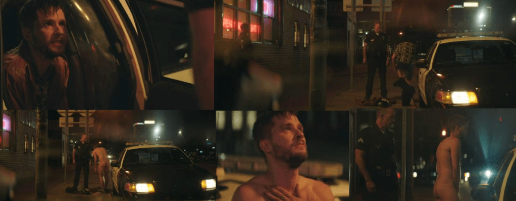 The officer squints his eyes and shrugs his shoulders and pulls out a report. ‘Well, I’ve already got the report filled and, ugh,’ he points to a part of the paper and shows it to the baristo as Jay looks nervously onward. ‘I mean, Justin, does, ugh, well, that says naked, right?’